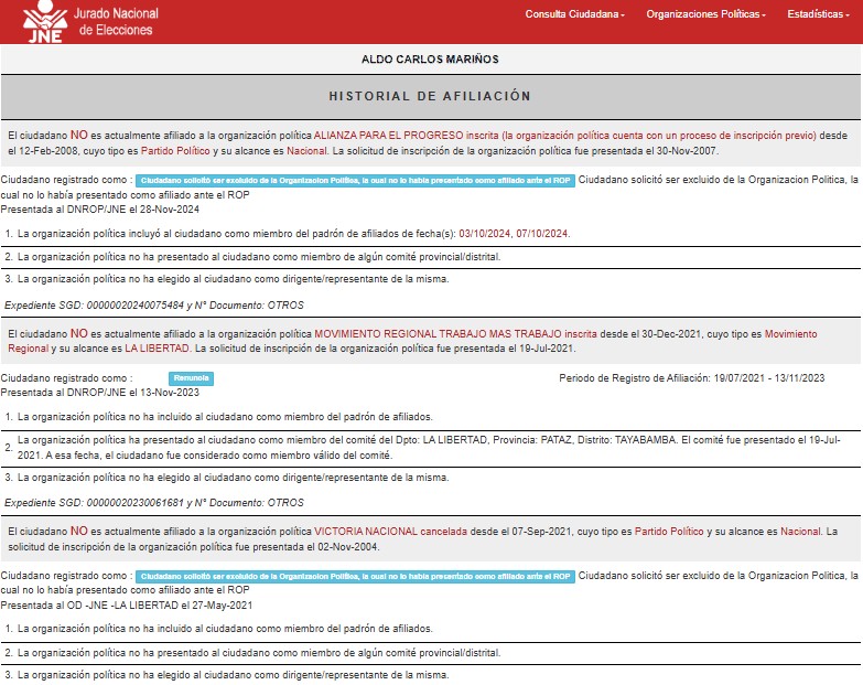 Pero no es todo. El año pasado renunció a Alianza para el Progreso. Según el Registro de Organizaciones Políticas (ROP) del Jurado Nacional de Elecciones, el 28 de noviembre de 2024, el mismo alcalde pidió ser excluido de la organización política de César Acuña.