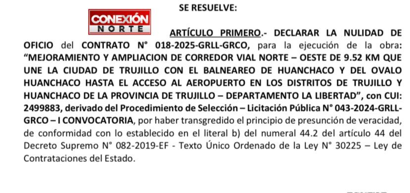 El gobernador regional de La Libertad, César Acuña, ya dio el primer golpe y firmó la Resolución Ejecutiva Regional N.°000536 y anuló el contrato de la obra del corredor vial norte de Huanchaco a Trujillo. El consorcio empresarial liderado por la joven empresaria Lucero Coca presentó documentación inexacta sobre un profesional clave, transgrediendo, según el referido documento, el principio de presunción a la veracidad.