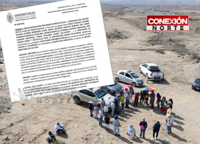 El caso de la invasión y usurpación en la zona arqueológica de la Quebrada Santo Domingo, reportada por Conexión Norte días atrás, ha sido recogido por la Fiscalía Provincial Mixta Corporativa de El Porvenir, que ha dispuesto iniciar una investigación preliminar contra 9 personas, entre ellas el representante de la Asociación de Agricultores y Frutícolas para la Exportación «Manos Solidarias». Esto, por el presunto delito contra el patrimonio en la modalidad de usurpación agravada.