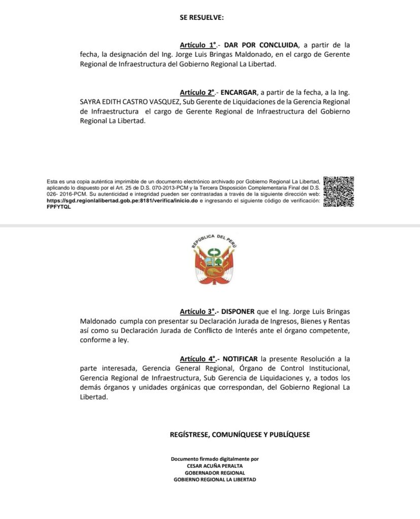 Otro punto anunciado fue que Acuña invocó a la Contraloría y al Ministerio Público para que investiguen todas las obras que hasta el momento ha realizado el Gobierno Regional de La Libertad y, para ello, se anunció que se harán llegar todos los expedientes técnicos de las obras realizadas tanto a la Fiscalía Anticorrupción como a la Contraloría. Así mismo, las licitaciones se paralizarán hasta que la situación se esclarezca.