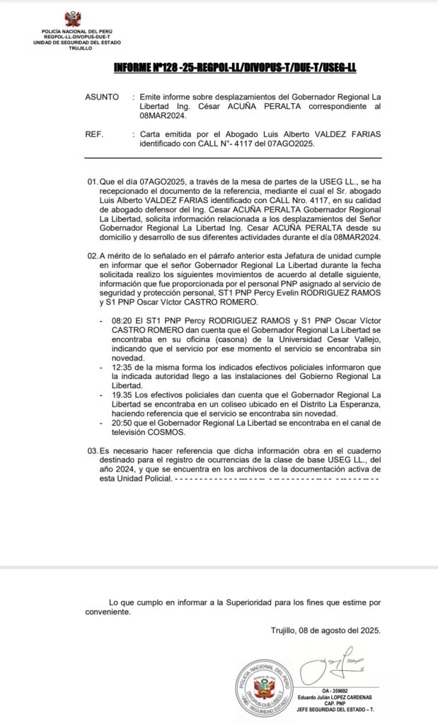 No obstante, es importante resaltar que Luis Valdez, abogado defensor de Acuña, además de dirigente de su partido, ofreció en una entrevista a RPP mostrar registros de “ubicación en tiempo real” para probar que la autoridad regional no se encontraba en la Casa de Gobierno; empero, esos registro de ubicación no fueron mostrados hasta ahora.