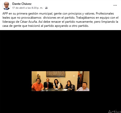 «APP en su primera gestión municipal, gente con principios y valores. Profesionales leales que no provocábamos divisiones en el partido. Trabajábamos en equipo con el liderazgo de César Acuña. Así debe renacer el partido nuevamente, pero limpiando la casa de gente que traicionó al partido apoyando a otro partido», escribió Chávez.