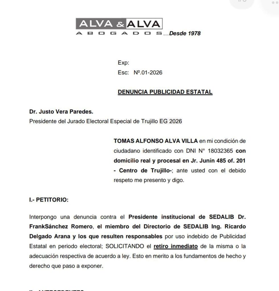 «Interpongo una denuncia contra el presidente de Sedalib Frank Sánchez Romero, el miembro del directorio de Sedalib Ricardo Delgado Arana y los que resulten responsables por uso indebido de publicidad estatal en periodo electoral, solicitando el retiro inmediato de la misma o la adecuación respectiva de acuerdo a ley«, señala el documento.