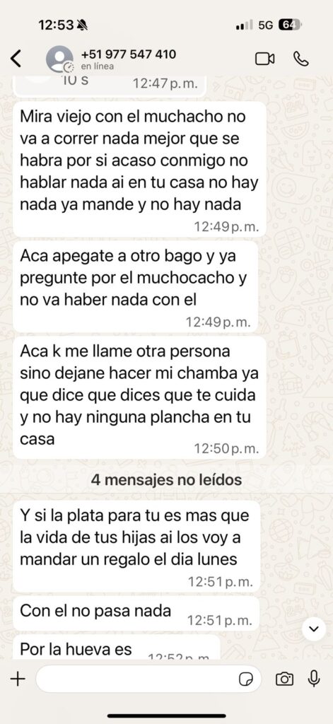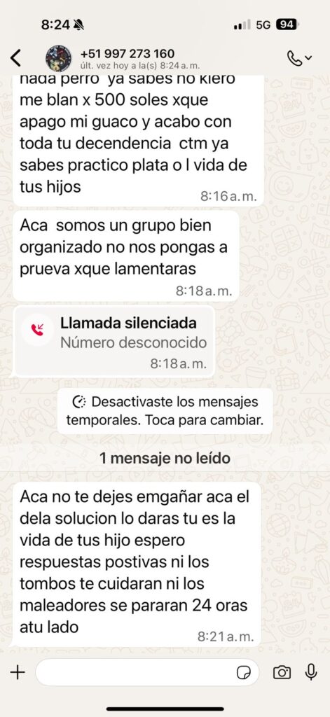 Según expresó en conferencia de prensa, junto al presidente del directorio, Frank Sánchez Romero, desde hace tres días viene recibiendo llamadas y mensajes intimidatorios desde cuatro números distintos, en los que le exigen 50 mil soles para no atentar contra él ni contra su familia.