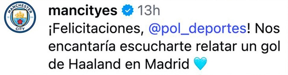 “¡Felicitaciones, @pol_deportes! Nos encantaría escucharte relatar un gol de Haaland en Madrid”, celebró la cuenta oficial en español del Manchester City junto al ícono de un corazón celeste como su camiseta, generando más de 12 mil reacciones.