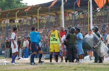 Fueron quince minutos de agresiones e insultos en los que el partido no podía reanudarse, motivo suficiente para que el árbitro Miguel Santibáñez suspendiera el partido… pero inexplicablemente no lo hizo.