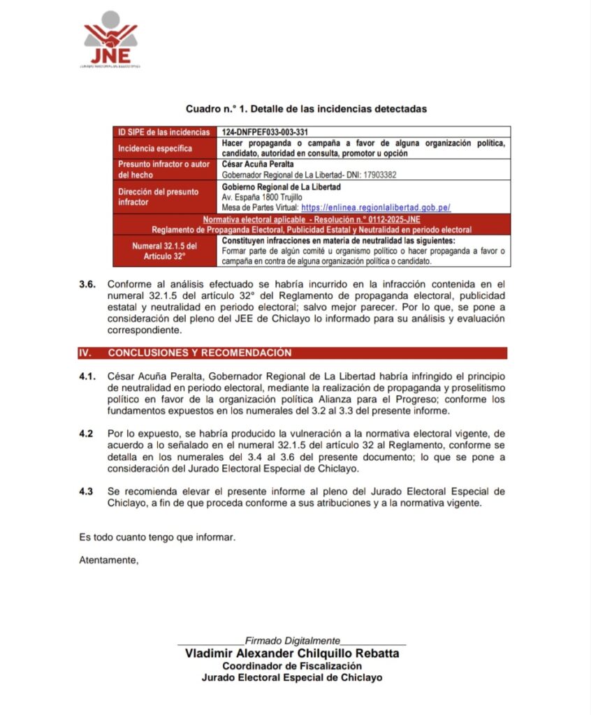 «César Acuña Peralta, Gobernador Regional de La Libertad habría infringido el principio de neutralidad en periodo electoral, mediante la realización de propaganda y proselitismo político en favor de la organización política Alianza para el Progreso. Por lo expuesto, se habría producido la vulneración a la normativa electoral vigente, de acuerdo a lo señalado en el numeral 32.1.5 del artículo 32 al Reglamento, conforme se detalla en los numerales del 3.4 al 3.6 del presente documento; lo que se pone a consideración del Jurado Electoral Especial de Chiclayo», se lee en el informe.