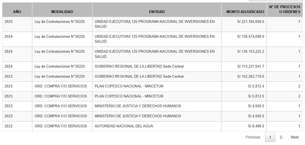 Conexión Norte se percató que el mismo caso ocurre en la obra “Hospital Otuzco” y “Hospital Santa Inés de El Porvenir”. Según los contratos revisados por este medio, en el caso de la obra del Hospital Otuzco el consorcio ganador de la licitación fue “Consorcio Otuzco”, que está conformado por las empresas Mesco Ingenieros, que tiene una participación del 90%, y CMO Group, con una participación del 10%. Según información de SUNAT, Mesco Ingenieros EIRL apenas se inscribió en el 2020, es decir, solo cuenta con 5 años de experiencia. Y, desde el 2022, logró contratos con el Estado con montos no mayores a los 10,000 soles.
