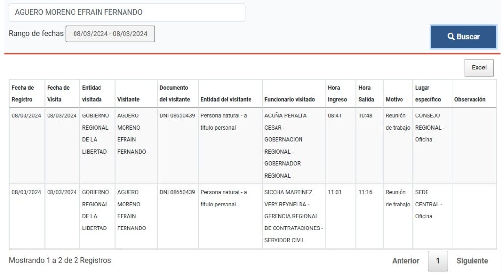 Conexión Norte revisó el registro de vistas del Gobierno Regional de La Libertad y pudo constatar que no solo Coca Rojas figura en los registros como visitante de César Acuña la mañana del 8 de marzo del 2024.