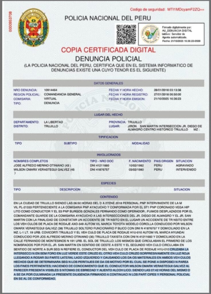 El semanario Hildebrandt en sus Trece revela el incidente de una borrachera en el año 2018 en las calles céntricas de Trujillo. Esto se encuentra en un acta policial del 27 de enero de ese año. Según el documento, el entonces fiscal Verástegui Gálvez fue intervenido por la Policía por conducir en estado de ebriedad, pasarse un semáforo en rojo y chocar contra otro vehículo. «Tenía 0.67 gramos de alcohol en la sangre», señala el medio.