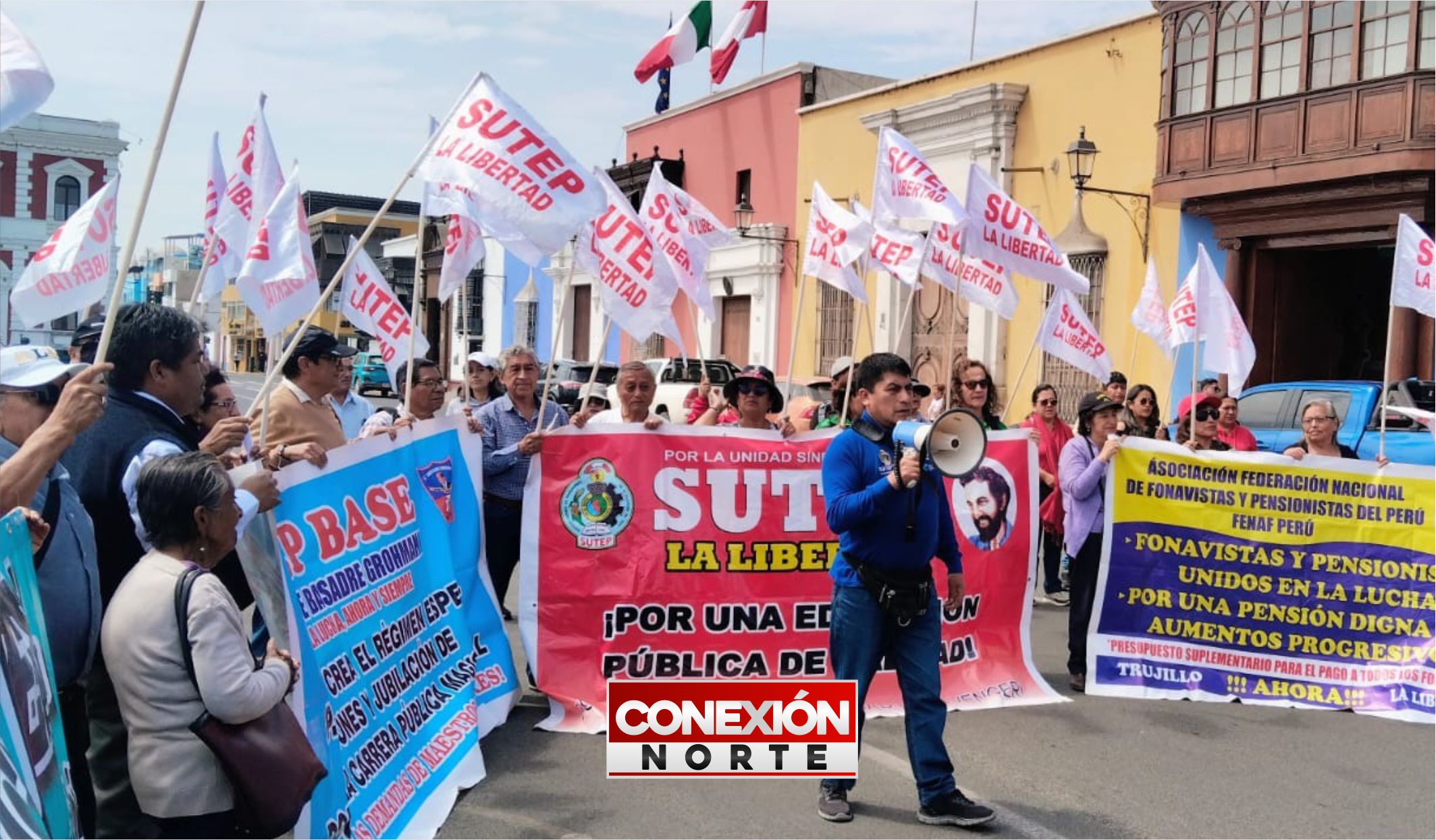 Con pancartas en mano y la voz en alto, un grupo de docentes cesantes y jubilados del Sindicato Unitario de Trabajadores en la Educación del Perú (SUTEP) realizó un plantón en las afueras de la sede regional del Gobierno para exigir la promulgación inmediata de la ley que incrementará sus pensiones de jubilación.