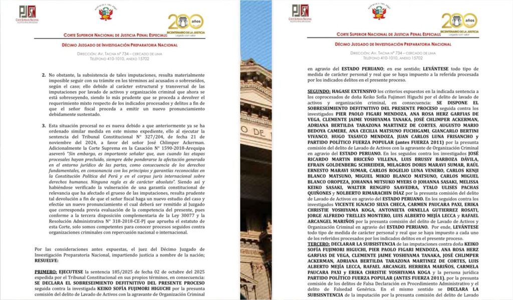 El TC marcó la pauta. El décimo Juzgado de Investigación Preparatoria Nacional de la Corte Superior Nacional de Justicia Penal Especializada resolvió ejecutar la sentencia del Tribunal Constitucional, declarando el sobreseimiento definitivo (archivo) del proceso seguido contra Keiko Fujimori y Fuerza Popular por la presunta comisión del delito de Lavado de Activos con el agravante de Organización Criminal en agravio del Estado Peruano.