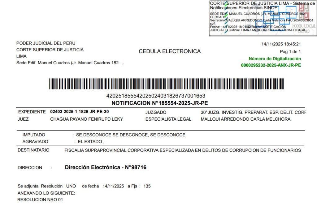 Fuentes del Ministerio Público señalaron que fueron notificadas el 15 de noviembre; sin embargo, fuentes judiciales confirmaron que el aviso se emitió el mismo 14. Tras la aprobación del operativo, la Fiscalía informó de inmediato a la Dircocor, responsable de garantizar la eficacia mediante observación, vigilancia y seguimiento (ovise).