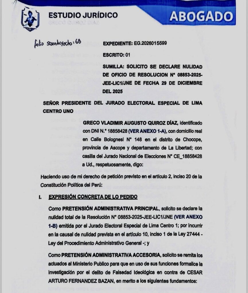 Justamente, con esa intención, el abogado Greco Quiroz presentó, el viernes 9 de de enero, un documento ante el JNE en el que solicita la exclusión del candidato de Un Camino Diferente.