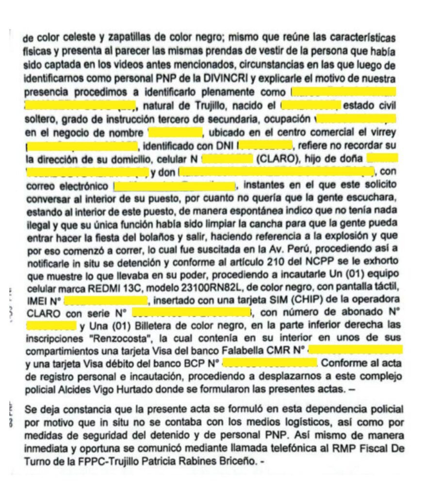 Según la tesis que expuso la Policía en aquel momento, las detenciones se dieron en el distrito del Alto Trujillo, donde se detuvo a tres sujetos (dos menores de edad y un adulto) que fueron encontrados con emulsión en las manos y con el vehículo mostrado en las cámaras de vigilancia. Así mismo, se logró la captura de otro sujeto que fue acusado de ser el conductor de los tres individuos.