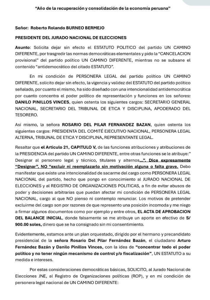 Un verdadero lío se ha armado en la agrupación política Un Camino Diferente, que postula a Arturo Fernández para la presidencia. La fundadora y personera Legal de dicho partido político solicitó al Jurado Nacional de Elecciones (JNE) que se anule la inscripción y vigencia del partido, debido a que Arturo Fernández, junto a personas de su entorno, pretendería tomar el control absoluto a través de artimañas.