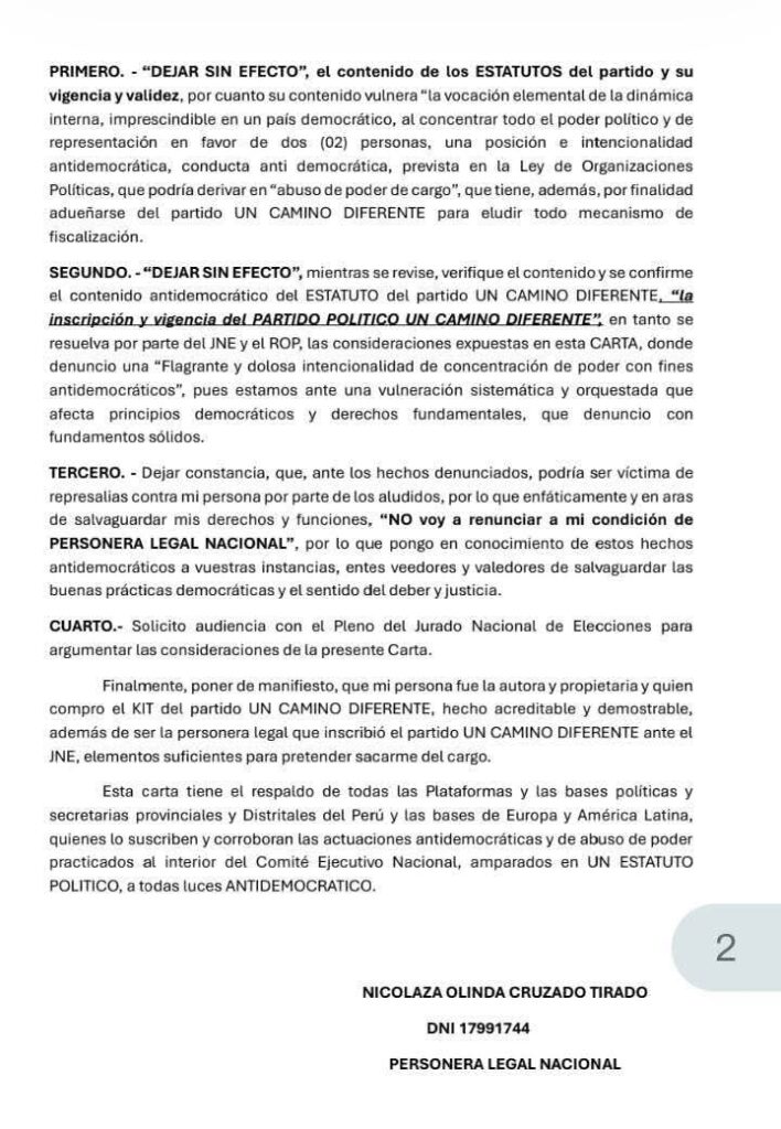 La personera legal y fundadora de la agrupación política, Nicolaza Cruzado Tirado, ha enviado un documento al JNE para pedir la nulidad de la inscripción y vigencia de dicho partido.