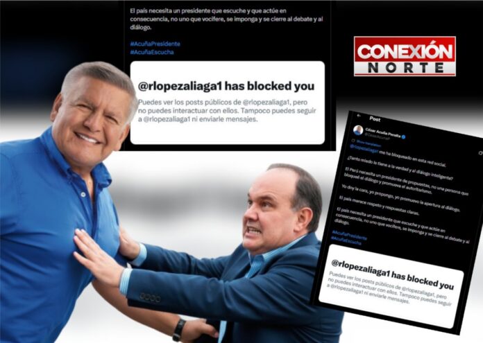 El candidato presidencial de Alianza Para el Progreso, César Acuña, fue bloqueado por su contrincante de Renovación Popular, Rafael López Aliaga, de la red social X. Esto, debido a que el líder apepista respondió por la misma red social los comentarios que emitió «Porky» sobre él en una entrevista, en donde afirmaba que la elección del presidente José María Balcázar de Perú Libre era por el «pacto mafioso» que tenía para seguir saqueando al Perú.