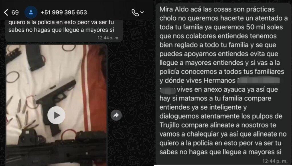 En las imágenes del video extorsivo, un sujeto desconocido muestra un arsenal de armas de largo alcance y lanza su advertencia. “Escúchame, estás hablando con la organización ‘Los Pulpos’. Te vas a alinear con 50 mil soles… mira todo el armamento que tenemos para ti y para tu familia en Tayabamba. No quiero a la policía”, se escucha en el material audiovisual.