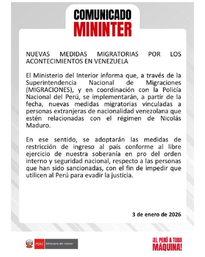 De acuerdo con el comunicado oficial, las disposiciones serán ejecutadas por la Superintendencia Nacional de Migraciones en coordinación con la Policía Nacional del Perú, e incluyen restricciones de ingreso al territorio nacional para personas extranjeras de nacionalidad venezolana que hayan sido sancionadas y mantengan relación con el gobierno de Maduro.