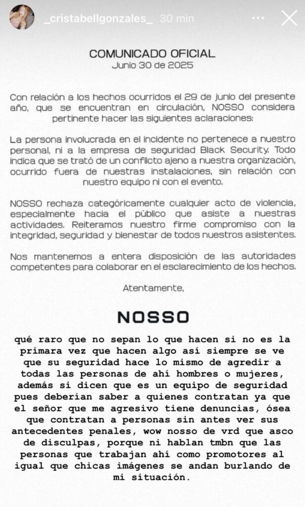 “En la salida, mi hermana dijo que la seguridad la estaba tocando de forma indebida. Pedí el libro de reclamaciones y el nombre del agresor, pero este huyó. Al insistir a otro seguridad, nos sacaron, primero a mí, luego a ella. Tres hombres y una mujer la retiraron, y ella me dijo que la volvieron a tocar. Reclamamos exaltados y la seguridad del video nos empujó y nos amenazó. Al grabarlo, se calmó, pero al apagar la cámara nos golpeó brutalmente, como se ve en los videos. Yo terminé en el piso con la rodilla lesionada, y mi hermana desmayada, con la nariz y el labio roto. Pedimos ayuda, pero la Policía nunca llegó. Tuve que cargarla hasta un taxi y llevarla al hospital, donde fue internada y suturada de urgencia. Ahora necesita una operación”, relató en sus redes sociales.
