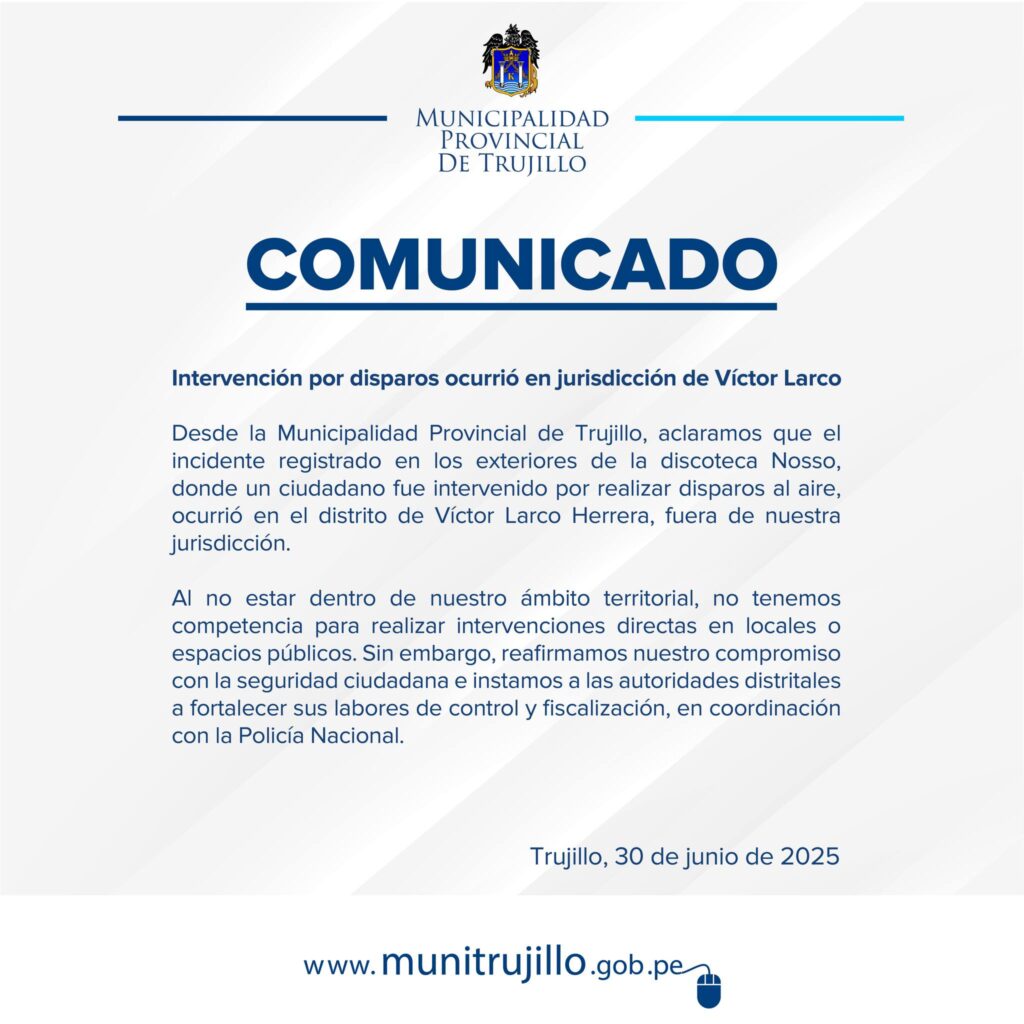 La Municipalidad Provincial de Trujillo también se ha pronunciado al respecto pidiendo a la Municipalidad Distrital de Víctor Larco Herrera, distrito donde se encuentra ubicada la discoteca, a tomar las medidas correspondientes de fiscalización y control del local nocturno.