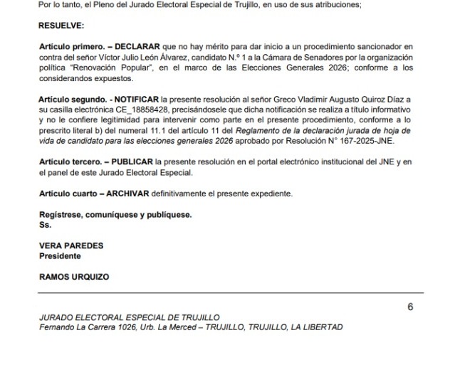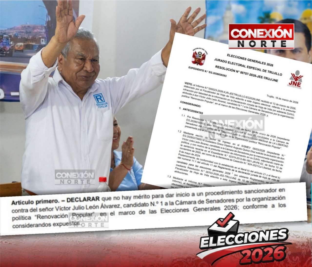 El Jurado Electoral Especial de Trujillo emitió una resolución (N° 00757-2026) que declara que no existe mérito para iniciar procedimiento sancionador alguno contra el candidato al Senado por La Libertad, Víctor León Álvarez, en el marco de las Elecciones Generales 2026, por lo cual el postulante sigue en carrera electoral.