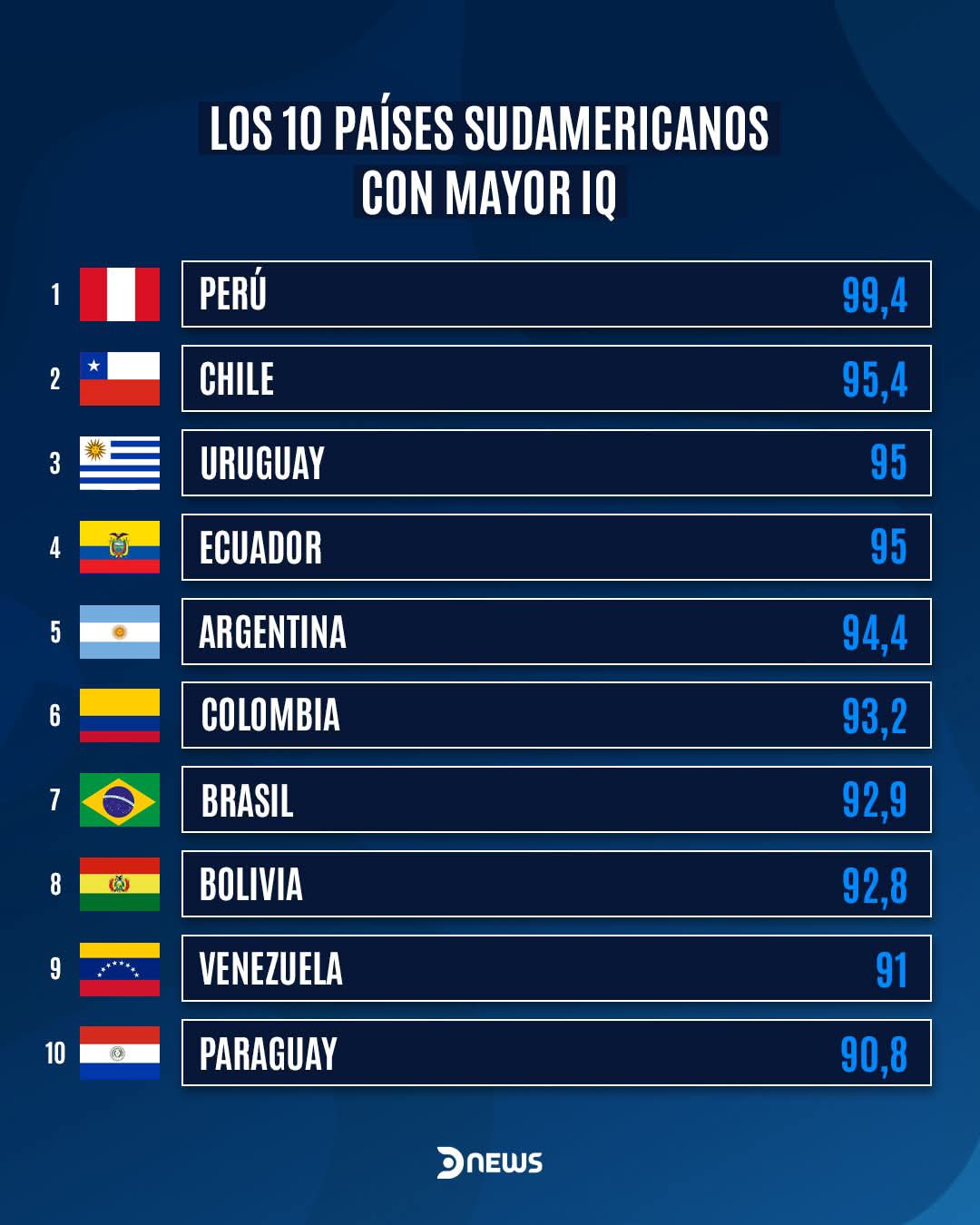 Según el estudio, Chile aparece en el segundo lugar con 95,4, seguido de cerca por Uruguay y Ecuador, ambos con un promedio de 95 puntos. En la mitad de la tabla se encuentran Argentina, con 94,4, y Colombia, con 93,2. Más abajo se ubican Brasil (92,9), Bolivia (92,8) y Venezuela (91). Finalmente, Paraguay cierra la lista con un promedio de 90,8.