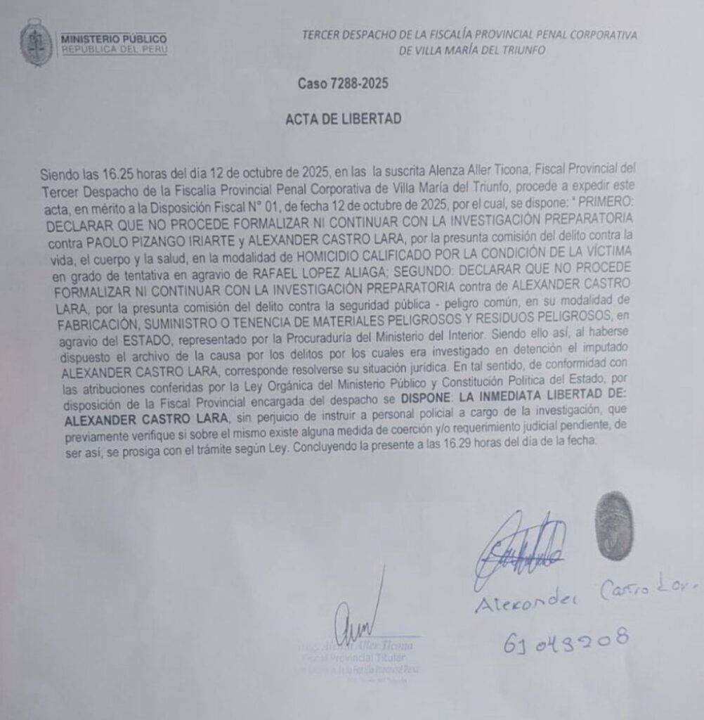 En otras palabras, la Fiscalía descartó con esta decisión que no hubo un intento de atentar contra la vida de López Aliaga. Y es que el acta que ordena la libertad de Alexander Castro Lara señala que no se encontró ningún indicio del supuesto intento de ataque, y por ello se declaró que no procede formalizar ni continuar con la investigación preparatoria contra ninguno de los dos jóvenes por la presunta comisión del delito contra la vida, el cuerpo y la salud, en modalidad de homicidio en grado de tentativa contra el burgomaestre.