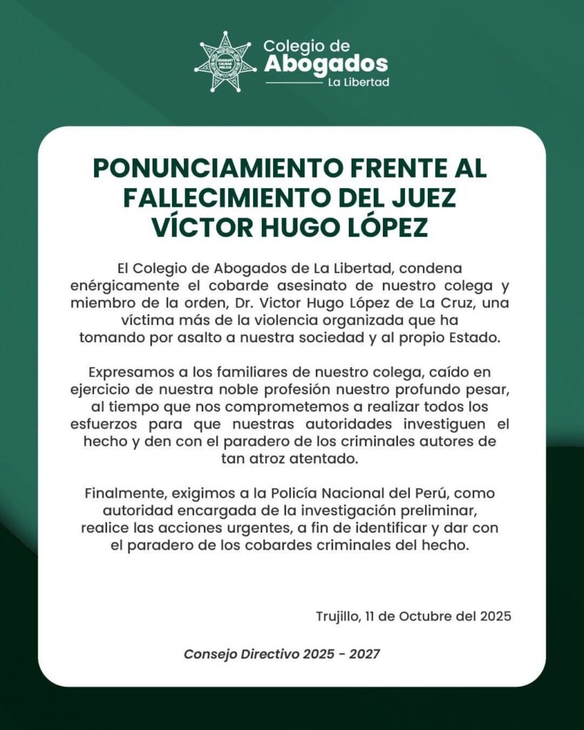 Un nuevo hecho criminal ha estremecido La Libertad. Víctor Hugo López, juez de Paz del distrito de Chicama, provincia de Ascope, fue acribillado cuando se encontraba en su oficina, ubicada en la avenida El Progreso de la referida jurisdicción.