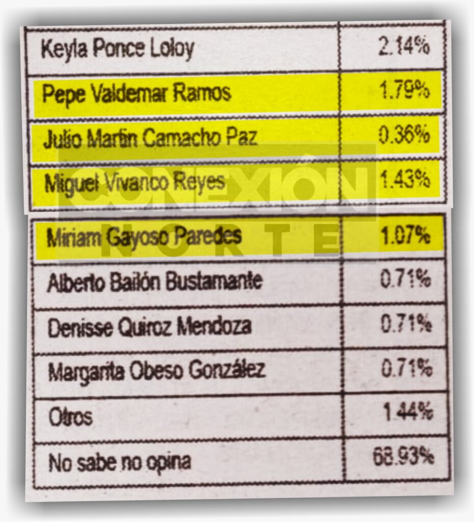 Por ejemplo, la lista de candidatos a senadores por La Libertad la encabeza, según esta encuesta, el apepista César Sandoval, con 7.3%, seguido por Víctor Flores de Fuerza Popular y Víctor León, de Renovación Popular.
