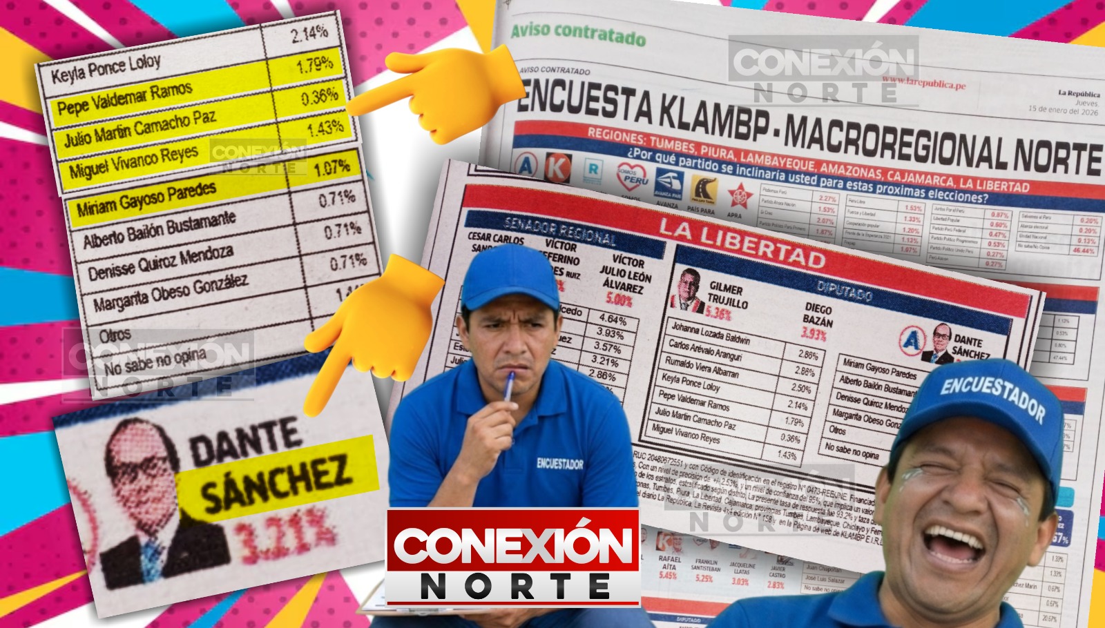 El jueves 15 de enero una encuesta, publicada como «Aviso Contratado» en un diario de circulación nacional, llamó la atención en medio de esta campaña electoral. Dicho estudio de intención de voto denominado «Encuesta Klambp», se aplicó en la macrorregión norte, en regiones de esta zona, entre ellas La Libertad, con resultados extraños, controversiales e incluso con groseros errores.