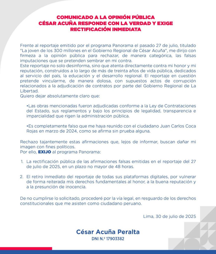 Así también, interrumpiendo sus vacaciones, el gobernador regional César Acuña emitió un comunicado exigiendo a Panorama que se rectifique en un plazo de 48 horas como máximo y que el reportaje sea borrado de todas las plataformas digitales del canal.